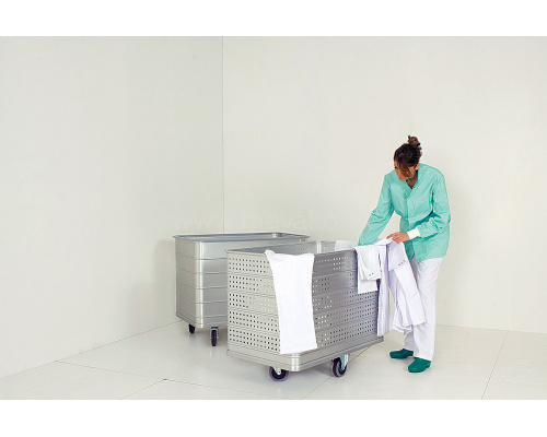 - Służy do transportu i manipulacji lekkimi materiałami, częściami lub odpadami o dużej objętości, wariant perforowany jest odpowiedni np. do zbioru i wywozu pościeli.