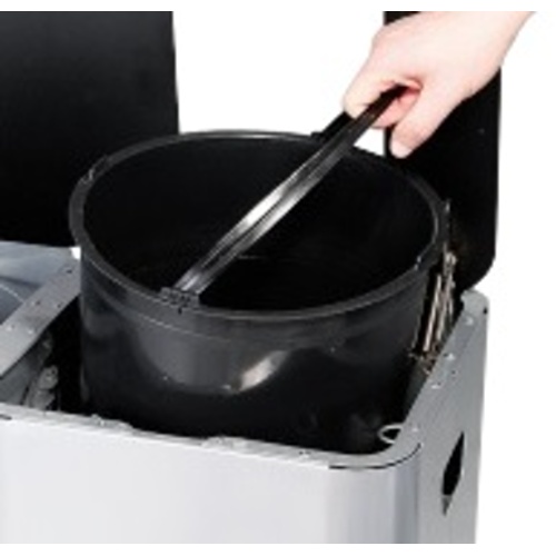 - Zamykana, odchylana pokrywa umożliwia dostęp do wewnętrznych plastikowych wkładów lub worków zamocowanych na obręczach.