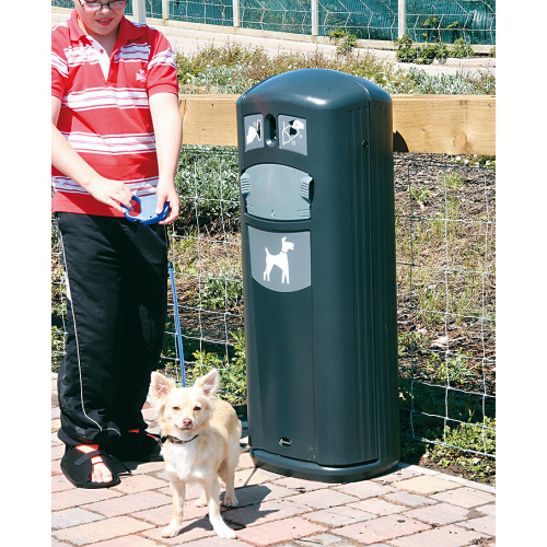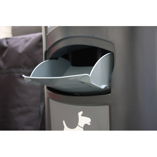 - Kompaktowa konstrukcja kosza obejmuje nie tylko sam kosz na psie odchody ale także zasobnik na worki.
