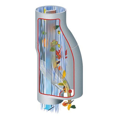 - Skutecznie separuje liście i duże nieczystości, zapobiegając zapchaniu rur.