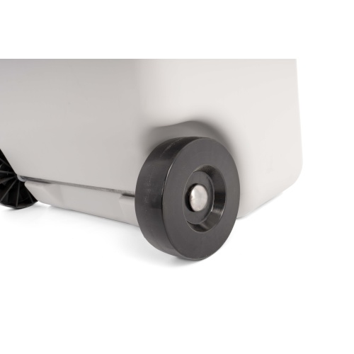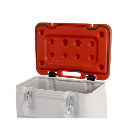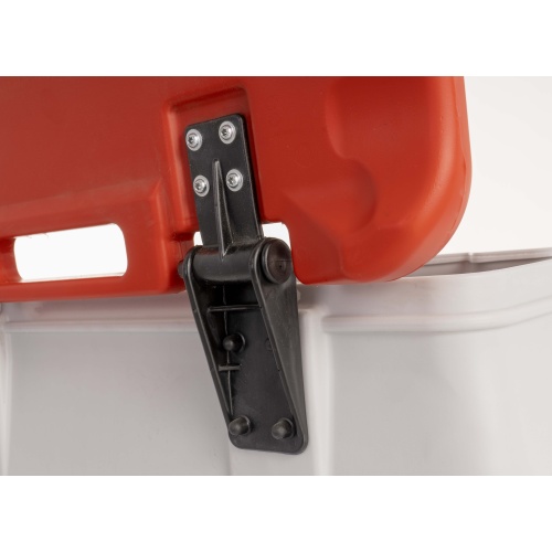- Standardowe wyposażenie: dwa kółka z tworzywa, dwie metalowe zapinki z zabezpieczeniem przed samoistnym otwarciem, uszczelnienie pokrywy.