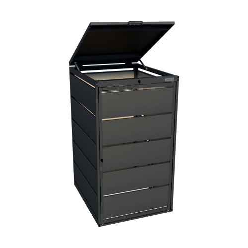 - Pokrywa z zabezpieczeniem w pozycji otwartej z możliwością blokowania pokrywy pojemnika łańcuszkiem dla łatwego otwarcia pojemnika.